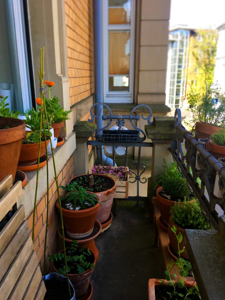 Dafür habe ich vier Ebenen: Das Fensterbrett, eine Reihe Töpfe an der Hauswand, ein selbstgebautes Bänkchen, welches den Raum ausnutzt, der durch die Wölbung des Geländers entsteht, und hängende Pflanzgefäße am Geländer.
