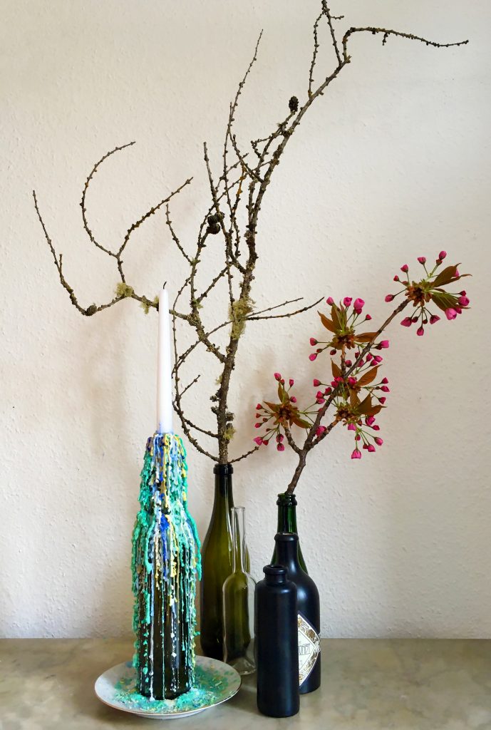 Ich verwende solche Flaschen als Kerzenständer oder als Vase. Das sieht nicht nur stilvoll aus, sondern jedes Einzelstück hat damit auch noch seine eigene Geschichte. Mein Kerzenständer zum Beispiel ist die erste Flasche Wein, die ich in meiner aktuellen Wohnung getrunken habe.